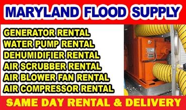 MARYLAND FLOOD SUPPLY & RENTAL COMPANY provides 24/7 DELIVERY & SET UP of Rental Equipment in the Entire State of MARYLAND. We offer dehumidifier rental, air blower fan rental, air scrubber rental, air compressor rental, water pump rental, generator rental and odor removal equipment rental service. We deliver rental equipment Any Where, Any Day, Any Time for building dehumidifying, house dehumidifying, carpet drying, wood floor drying, wall drying and air purifying. We have 30 MINUTE EMERGENCY RESPONSE for flood pump out, water cleanup, sewage cleanup, mold cleanup and smoke cleanup service.