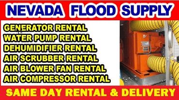 NEVADA FLOOD SUPPLY & RENTAL COMPANY provides 24/7 DELIVERY & SET UP of Rental Equipment in the Entire State of NEVADA. We offer dehumidifier rental, air blower fan rental, air scrubber rental, air compressor rental, water pump rental, generator rental and odor removal equipment rental service. We deliver rental equipment Any Where, Any Day, Any Time for building dehumidifying, house dehumidifying, carpet drying, wood floor drying, wall drying and air purifying. We have 30 MINUTE EMERGENCY RESPONSE for flood pump out, water cleanup, sewage cleanup, mold cleanup and smoke cleanup service.