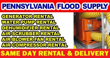 PENNSYLVANIA FLOOD SUPPLY & RENTAL COMPANY provides 24/7 DELIVERY & SET UP of Rental Equipment in the Entire State of PENNSYLVANIA. We offer dehumidifier rental, air blower fan rental, air scrubber rental, air compressor rental, water pump rental, generator rental and odor removal equipment rental service. We deliver rental equipment Any Where, Any Day, Any Time for building dehumidifying, house dehumidifying, carpet drying, wood floor drying, wall drying and air purifying. We have 30 MINUTE EMERGENCY RESPONSE for flood pump out, water cleanup, sewage cleanup, mold cleanup and smoke cleanup service.