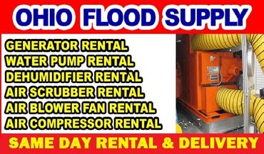 OHIO FLOOD SUPPLY & RENTAL COMPANY provides 24/7 DELIVERY & SET UP of Rental Equipment in the Entire State of OHIO. We offer dehumidifier rental, air blower fan rental, air scrubber rental, air compressor rental, water pump rental, generator rental and odor removal equipment rental service. We deliver rental equipment Any Where, Any Day, Any Time for building dehumidifying, house dehumidifying, carpet drying, wood floor drying, wall drying and air purifying. We have 30 MINUTE EMERGENCY RESPONSE for flood pump out, water cleanup, sewage cleanup, mold cleanup and smoke cleanup service.