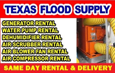 TEXAS FLOOD SUPPLY & RENTAL COMPANY provides 24/7 DELIVERY & SET UP of Rental Equipment in the Entire State of TEXAS. We offer dehumidifier rental, air blower fan rental, air scrubber rental, air compressor rental, water pump rental, generator rental and odor removal equipment rental service. We deliver rental equipment Any Where, Any Day, Any Time for building dehumidifying, house dehumidifying, carpet drying, wood floor drying, wall drying and air purifying. We have 30 MINUTE EMERGENCY RESPONSE for flood pump out, water cleanup, sewage cleanup, mold cleanup and smoke cleanup service.
